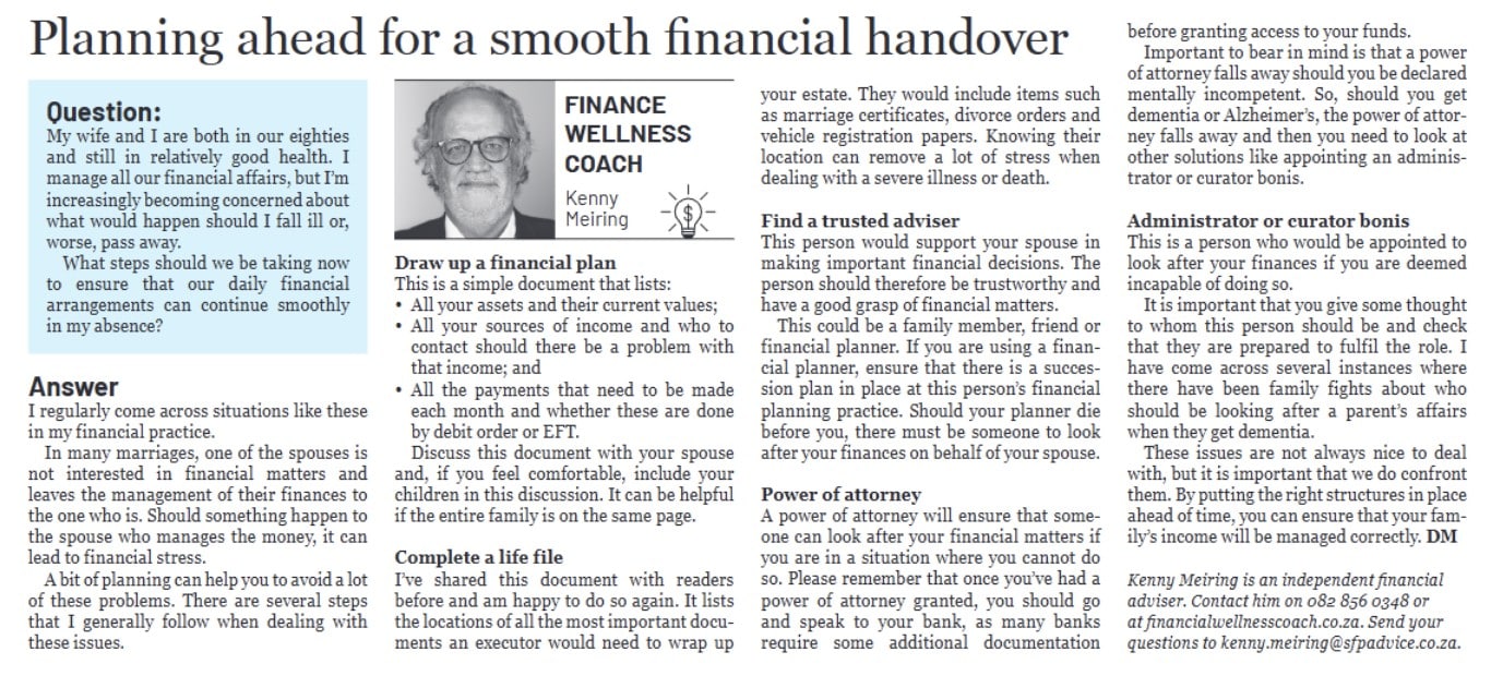 This could be a family member, friend or financial planner. If you are using a financial planner, ensure that there is a succession plan in place at that financial planning practice. Should your planner pass away before your spouse, there must be someone to look after the finances.