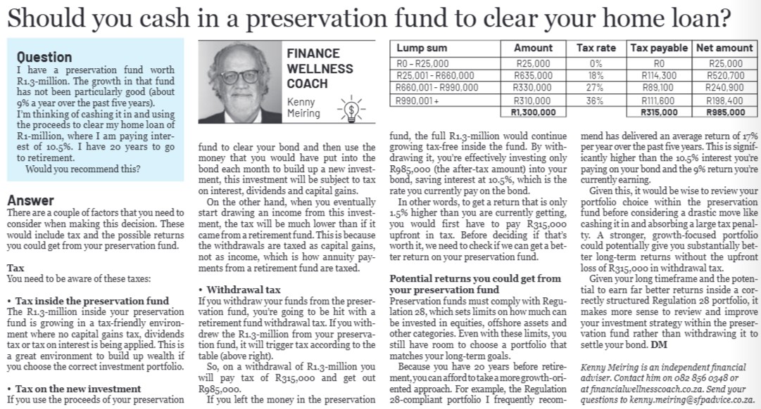 I have a preservation fund worth R1.3 million. The growth in that fund has not been particularly good (around 9% a year over the past 5 years). I’m thinking of cashing it in and using the proceeds to clear my home loan of R1million where I am paying interest of 10.5%. I have 20 years to go to retirement.